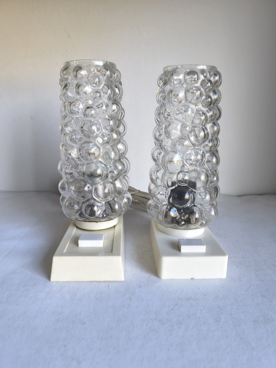 Paar bubbelglas tafellampen. Retro jaren 60. Helder glas met witte voet. Origineel snoer en schakelaar. De lampen werken naar behoren. Inclusief lichtbron.