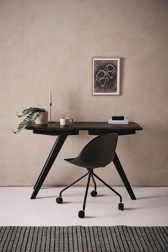Nieuw in doos OF gemonteerd! Originele prijs: €1209,-. Een design bureau van massief mangohout. Designer: Jotex Design Studio. Het bureau heeft een statige look met invloeden uit de jaren zestig dankzij het elegant gewelfde bureaublad met zacht afgeronde randen. De schuine poten geven het bureau een stoerdere uitstraling, wat een mooie aanvulling is op de zachte look-and-feel van het materiaal. Elk CONNECTICUT bureau is handwerk en daarom uniek. Dankzij de afmetingen kan het bureau op veel verschillende plekken in huis staan en kun je eenvoudig een stijlvol thuiskantoor creëren. Eenvoudige montage. Materiaal: Mangohout. Kleur: Zwart. Afmetingen: Hoogte 75 cm, tafelblad 50x120 cm. Onderhoud: Afnemen met een droge doek. Tips/advies: CONNECTICUT is ook mooi als wandtafel.