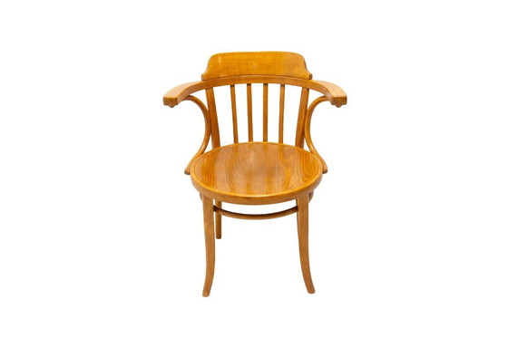 Vervaardigd uit gebogen hout met een gebogen rugleuning en zitting, benadrukt hij de technische precisie en het vakmanschap van Thonet. Het oppervlak is zorgvuldig gerestaureerd, waarbij de natuurlijke houtkleur en de originele structuur behouden zijn gebleven.