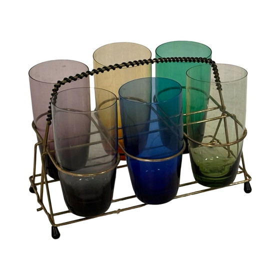 Ideale startersset of toevoeging aan een vintage bar. Een complete set van zes felgekleurde glazen en een messing montuur met handvat. Door het formaat een ideaal longdrink- of cocktailglas. Past goed in elke vintage setting of atomic age / mcm bar. In goede, vintage staat. Wordt verzonden met Postnl, afhalen op aanvraag in Hilversum.