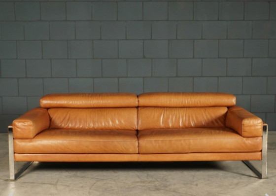 Lederen 2,5-zits bank Romeo-LE18 van Calia Italia in camelkleurig anilineleder. Strak, laag design met opklapbare hoofdsteunen, chromen poten en zeer comfortabel. In mooie staat met lichte gebruikssporen. Nieuwprijs ca. €6.000. Afm.: 220×108×68–90 cm (zithoogte 41 cm).