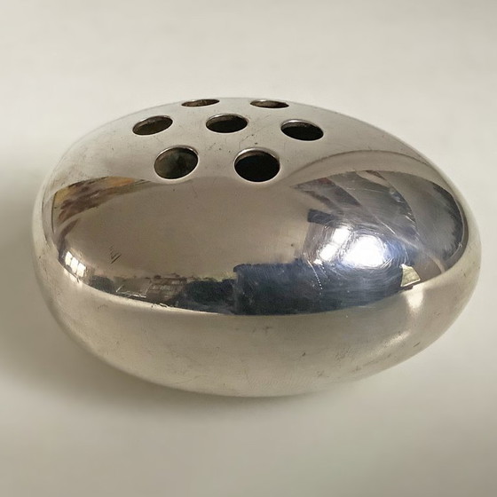 Deense modernistische vintage verzilverde bloemenvaas, bloemenkikker ontworpen door Hans Bunde en geproduceerd door Carl Cohr uit Fredericia, Denemarken in de jaren 50. Deze moderne eivormige bloemenhouder uit het midden van de eeuw is gemaakt van messing met zware verzilvering (90 micron). Netjes aan onderzijde gemerkt COHR, Denmark, epa (gegalvaniseerd messing). Er zijn zeven gaten waarin bloemen kunnen worden gestoken, met een ander intern gedeelte met negentien gaten om de bloemstelen te ondersteunen. In goede vintage staat met gebruikssporen, passend bij de leeftijd en het gebruik. Formaat breed 7 cm, hoog 5 cm en diep 9 cm.