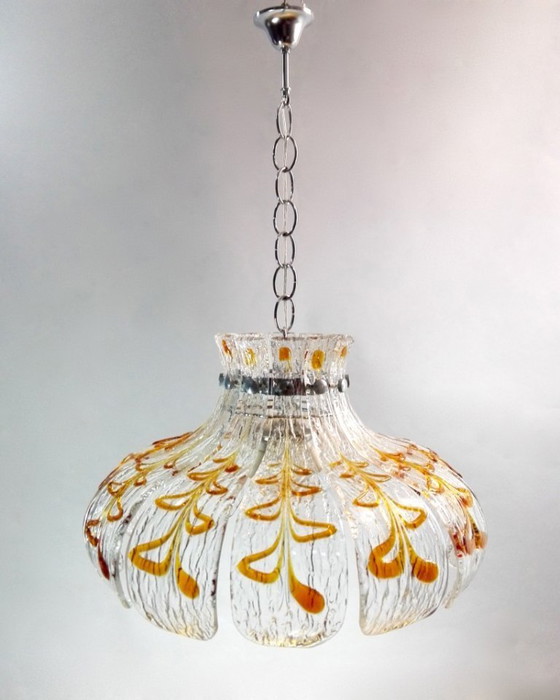 Dit verbazingwekkende "bloemarmatuur" heeft 12 heldere bloembladvormige lampenkappen van zwaar Murano glas met details van gebrand oranje glas. De glazen bloemblaadjes zijn bevestigd op een rond verchroomd frame.