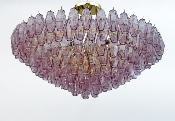 Italian chandelier from the island of Murano. This piece has a brass frame that supports an impressive array of 178 Murano glass, eggplant-colored, polyhedral shaped pieces. Illuminated by 13 E14 bulbs (for the USA we supply E12 adapters). The Polyhedral component was first made by Carlo Scarpa in 1958 for Venini.