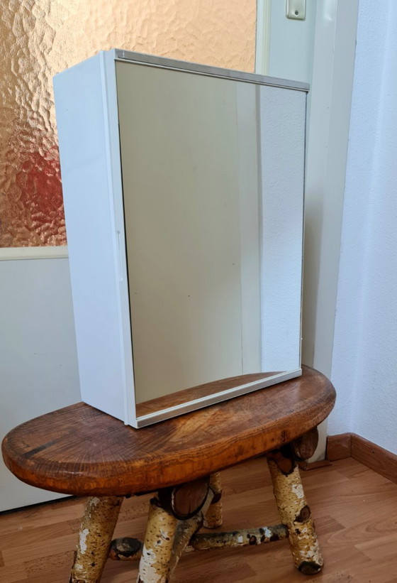 Een mooi badkamermeubel medicijnkastje of cabinet model Frejus geproduceerd door Carrara & Matta in de jaren 70. Deze zeldzame kast met spiegel aan de voorzijde is gemaakt van kunststof met 1 deur met meerdere binnenvakken. In prima algemene staat met lichte tekenen van verkleuring van het bakeliet. Dit kastje is van Italiaanse makelij, het bedrijfslogo ziet u aan de binnenkant. Carrara en Matta werd in 1940 in Turijn opgericht en was gespecialiseerd in badkameraccessoires en -meubilair. Al snel werd het merk succesvol en veel verkocht.