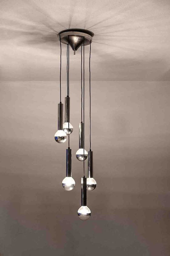 Indrukwekkende plafondkroonluchter in mid-century modern design met zes extra grote halfspiegelende lampen. Deze lamp is volledig chroomkleurig en verkeert in zeer goede staat.