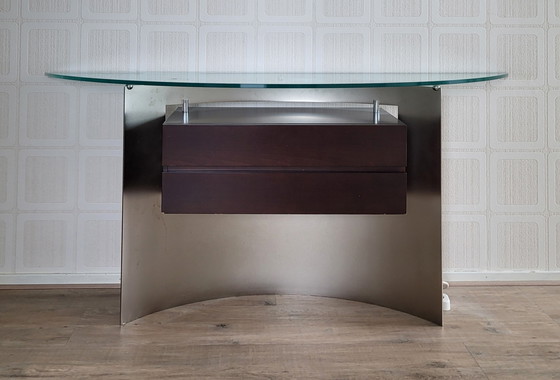 Italiaans postmodern design, halfronde slanke vorm. Dit is een vintage Casprini bijzettafel uit de jaren negentig, met een strak glazen blad en een stevig RVS frame. De tafel heeft twee houten lades, die zowel stijl als functionaliteit bieden. Het unieke ontwerp en de combinatie van materialen maken het een opvallend stuk voor elk vertrek. Handig in de hal met een spiegel erboven. Lichte gebruiksporen aan de lades.