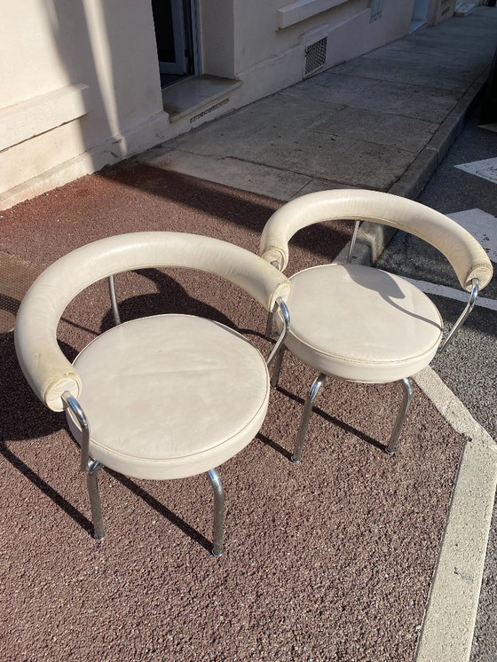 Een icoon, de LC7 werd in 1927 ontworpen door Charlotte Perriand voor haar eigen appartement op de Place Saint-Sulpice in Parijs. Het werd voor het eerst tentoongesteld op de Salon des Artistes Décorateurs uit 1928 en werd een jaar later ook getoond op de Salon d’Automne, waar het deel uitmaakte van een collectie die Charlotte Perriand samen met Le Corbusier en Pierre Jeanneret creëerde. De stoelen zijn goed gebruikt wat te zien op de foto's.