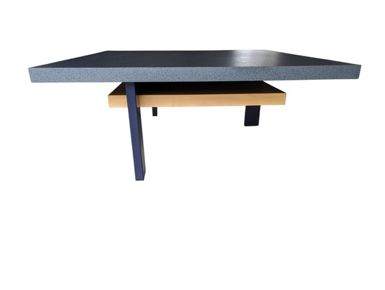 Strakke designe salontafel van Castelein. Orgineel zat er een blad van glas op maar om praktische redenen hebben wij dit blad van HPL erop laten maken door meubelzaak Flier in Emmen bij aankoop. Het onderblad is van beukenhout. Drie stalen poten in donker koningsblauw. Het blad is gemêleerd in grijs, zwart, blauw. Oogt grijs blauw.