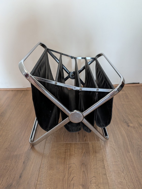 Deze elegante Castelli krantenhouder uit de jaren 60 is een prachtig voorbeeld van Mid Century Modern design. Het strakke metalen frame gecombineerd met de zwarte leren vakken biedt niet alleen functionaliteit maar ook een stijlvolle toevoeging aan uw interieur.