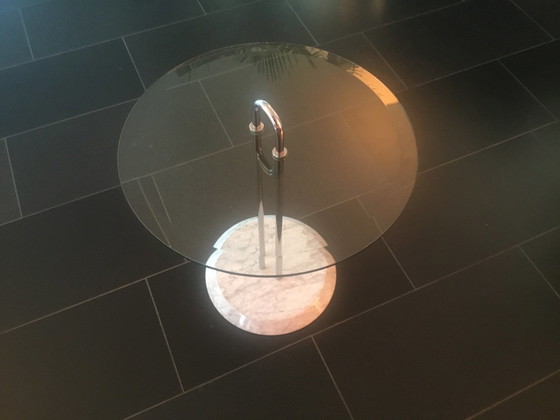 Een vintage bijzettafel van Vico Magistretti voor Cattalan Italia uit de jaren 80 van de vorige eeuw. Met een marmeren voet, verchroomde U-handvat en buizen en glasplaat met facetrand. Doorsnee glasplaat is 50 cm, hoogte glasplaat is 51 cm en hoogte inclusief U-handvat 60 cm