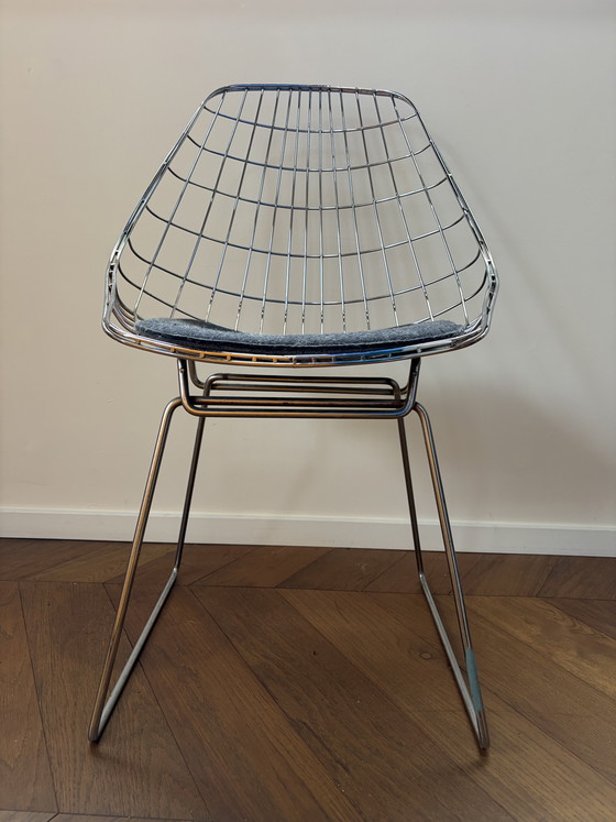Maak kennis met de Cees Braakman SM05 draadstoel, een toonbeeld van mid-century modern design. Deze stoel combineert moeiteloos vorm en functie, waardoor hij perfect past in elk eigentijds interieur. Het slanke metalen frame wordt gecomplementeerd door een comfortabel grijs textielkussen, wat zorgt voor zowel stijl als comfort.