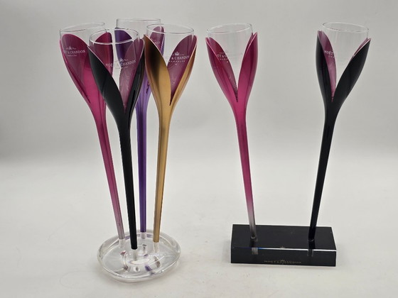 De glazen zijn uitneembaar uit de kunststof tulp zodat u ze kan afwassen. In de glazen een gegraveerd logo van Moët & Chandon. Beide staan op een plexiglas (acrylic) basis voorzien van logo. De houder met de 4 glazen heeft een transparante basis. De houder met de 2 glazen heeft een zwarte ondergrond.