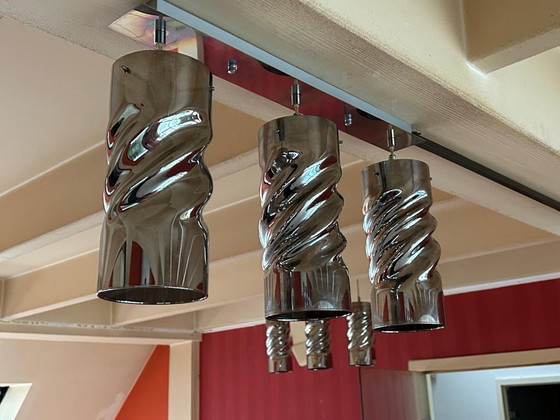 Prachtige vintage design hanglampen in spiegelend chroom, met een elegante gedraaide vorm. Typisch jaren 70/80 design en echte blikvangers in elk interieur.