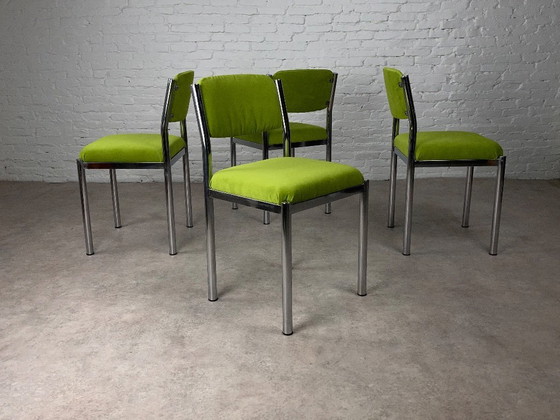 De stoelen werden volledig herwerkt. Vers schuim verpakt in mosgroen fluweel, een stof van 60.000 Martindale, gekozen vanwege zowel stevigheid als zachtheid. Het contrast tussen koel metaal en warm textiel is onweerstaanbaar.