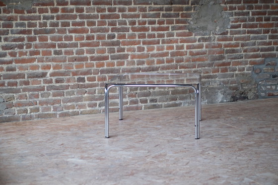 Hoor ik daar jaren ‘80? Je weet wel, het decennium dat helemaal terug is. En nu zéker met deze lage tafel in chrome met een glazen oppervlak. Ze bevindt zich in een goede maar gebruikte staat. Het glas heeft oppervlakkige krasjes maar zeker niks opvallends. Het chrome krijgt nog een poetsbeurt en is dan opnieuw perfect. Wie geeft ze een tweede euh nee, derde leven? Hier genoten we namelijk zelf van dit stuk in onze eigen heim. Afmetingen (cm): h 47, b 80, l 80 Beschikbaar: 95