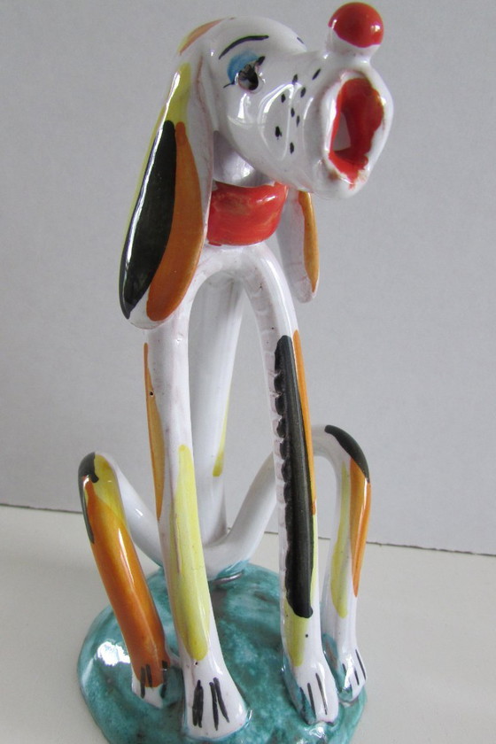 Een uniek vintage verzamelobject uit het midden van de 20e eeuw. Keramieken beeldje van een hond van Ciacci, Italië. kenmerkende lange, gestileerde vormen en kleurrijke handbeschilderde patronen.
