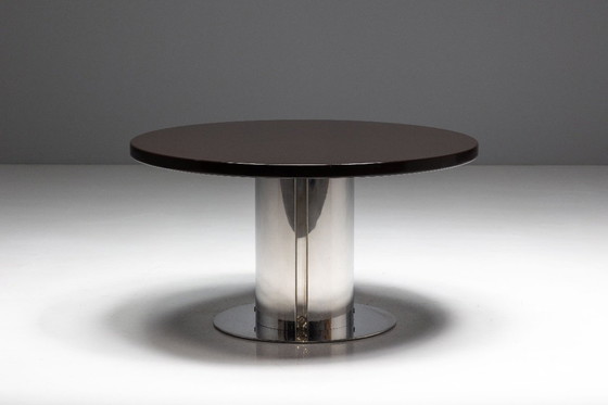 De Cidonio eettafel, ontworpen in 1968 en geproduceerd in de jaren 70, is een verfijnd voorbeeld van Italiaans modernistisch design. De tafel heeft een rond blad van donker gebeitst hout in combinatie met een cilindrische, gepolijste stalen voet. De reflecterende stalen voet zorgt voor een visuele lichtheid en benadrukt tegelijkertijd de sculpturale uitstraling van het meubelstuk.