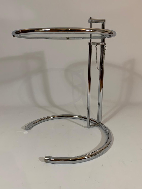 ClassiCon bijzettafel E1027 ontworpen door Eileen Gray. Tafel is in goede staat, alleen klein barstje in het glas. Er is geeb chip uit het glas, al lijkt dat wellicht zo op de foto.