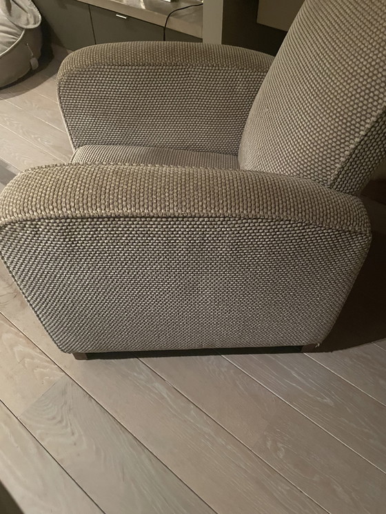 - De fauteuil is bekleed met een zachte textielbekleding in een rustgevende beige tint en straalt een warme en uitnodigende sfeer uit.