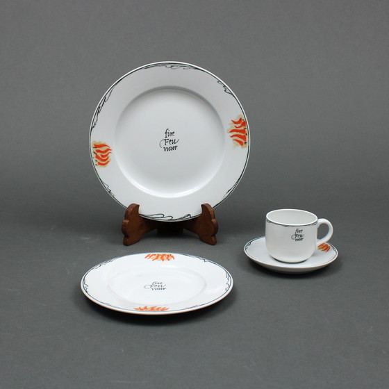 Servies set, in een oplage van 250 exemplaren, uitgebracht ter gelegenheid van het 175 jarig bestaan van de kamer van koophandel Amsterdam, in samenwerking met Museum Fodor, Amsterdam. Bevind zich in de collectie van het Centraal Museum Utrecht, Inventarisnummer 25773/001-004 Ontwerp: Jacobus Westerik (1924-2018) Model: Fire, Feu, Vuur Fabrikant: Royal Mosa Ontwerp jaar: 1986 Afmeting: Grote bord, 27 cm doorsnee, kleine bord, 21 cm doorsnee, 14,5 cm doorsnee, kopje, 8 cm doorsnee en 7 cm hoog Gewicht: 1884 gr Conditie: Goede staat, in de originele doos Aantal objecten: 5 (doos, groot bord, klein bord, schotel en kopje)