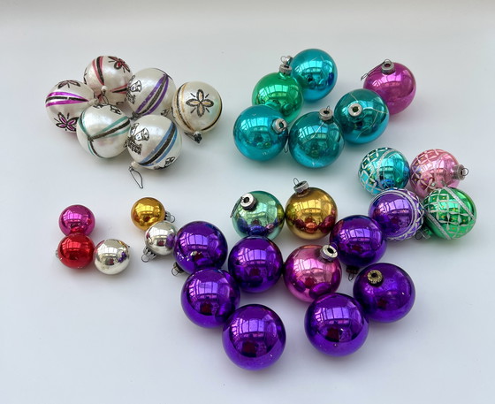 De ornamenten zijn gemaakt van mondgeblazen glas met een spiegelende binnenlaag. Er zijn lichte gebruikssporen aanwezig (kleine krasjes, minimale patina, af en toe lichte slijtage aan de ophanglusjes) die passen bij hun leeftijd. Dit zijn geen moderne objecten, maar authentieke decoratieve voorwerpen met een geschiedenis.