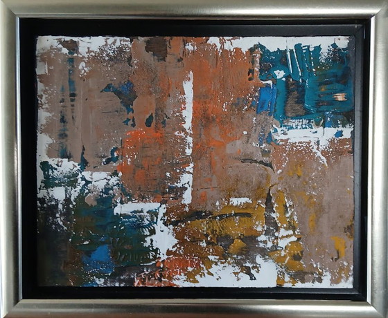 Ontdek de intrigerende schoonheid van dit abstracte schilderij, een werk dat een levendige mix van kleuren en texturen biedt. Dit kunstwerk, met zijn rijke bruine, blauwe, oranje, witte en gele tinten, voegt een dynamische en expressieve sfeer toe aan elke ruimte.