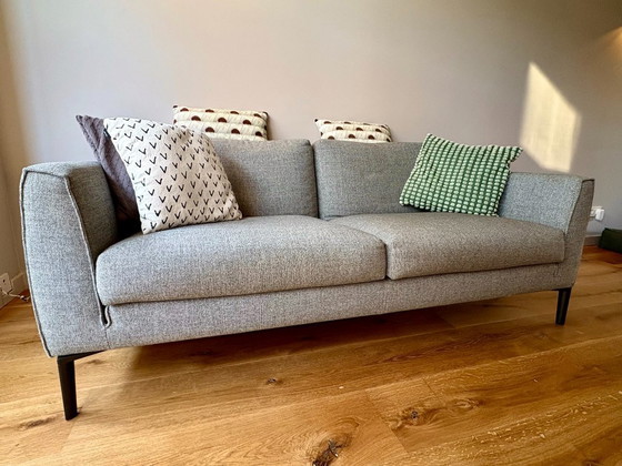 De bank Design on Stock model Heelz is aangekocht in 2018 en heeft een grijs gemêleerde stof met strakke zwarte poten, wat zorgt voor een moderne en tijdloze uitstraling.