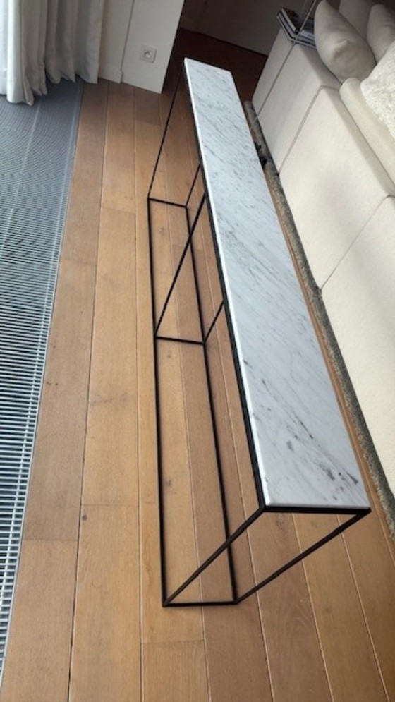 Deze elegante console tafel combineert de robuuste uitstraling van zwart gietijzer met de verfijnde schoonheid van een marmeren blad. Het strakke, moderne ontwerp maakt het een veelzijdig stuk dat moeiteloos in diverse interieurstijlen past.