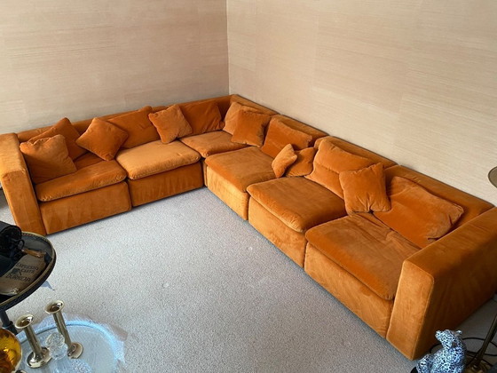 De bank verkeert in opmerkelijke staat. Aankoopdatum: 23 november 1977, aankoopbon aanwezig. Sindsdien is dit prachtige meubelstuk ongebruikt gebleven, afgedekt met linnen lakens. Met zijn levendige oranje/cognac kleur en hoogwaardige stoffen bekleding straalt dit vintage meubelstuk een warme en uitnodigende sfeer uit.