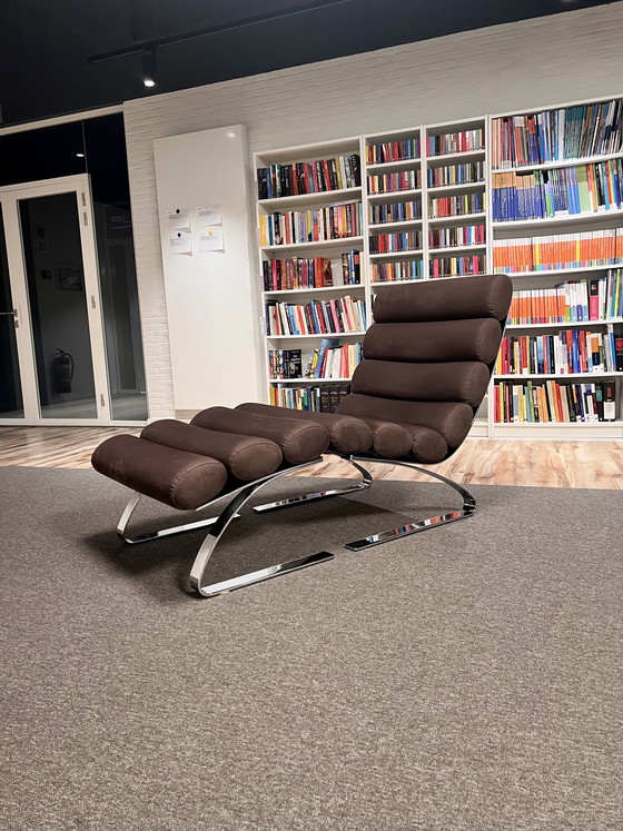 Het gaat om een uitvoering in alcantara stof (voelt aan als suede), gecombineerd met een inox onderstel.