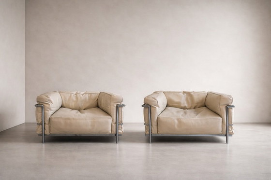 Het betreft een originele Cassina set (geen replica), herkenbaar aan de labels en de LC3 gravering in het stalen frame.