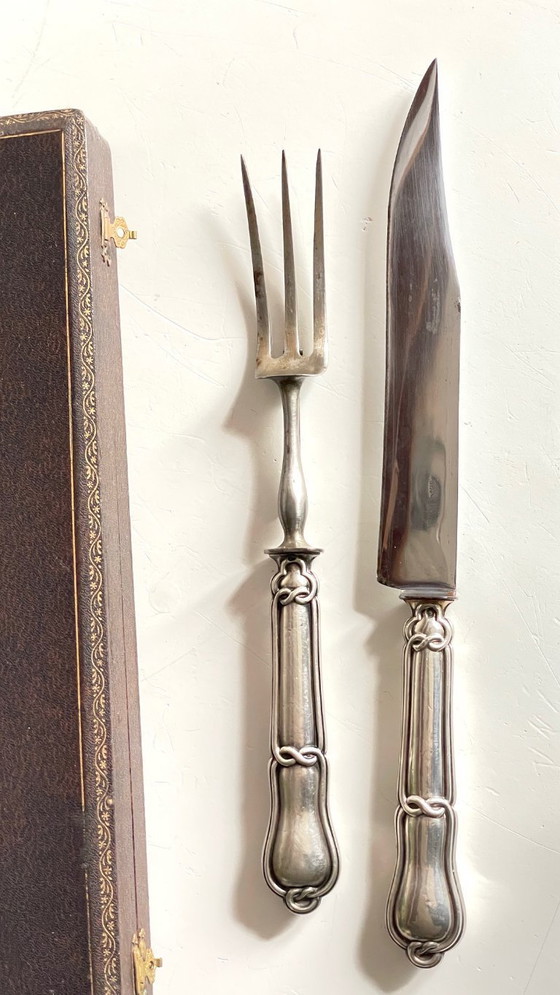 Très beau set de COUVERTS à Viande en Argent à Minerve Casquée PARIS. Un bel ensemble ancien ( entre 1838 et 1973 selon poinçon) composé d'une Grande Fourchette, d'un Grand couteau et de leur boite de Rangement.