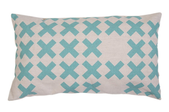 Het Particolare Cross kussen in lightblue en grey met een formata van 35cm x 60cm. De getoonde afbeeldingen zijn de werkelijke weergave van het product.