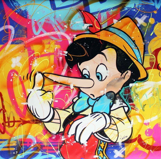 Origineel kunstwerk van Cross Magri, een opkomende Spaanse kunstenaar wiens stijl popart en streetart combineert met een opmerkelijke visuele intensiteit. In dit werk getiteld "Imperial (Pinocchio)" herinterpreteert de kunstenaar het beroemde personage Pinocchio vanuit een eigentijdse en provocerende invalshoek, waarbij ironie, kleur en grafische kracht samensmelten.