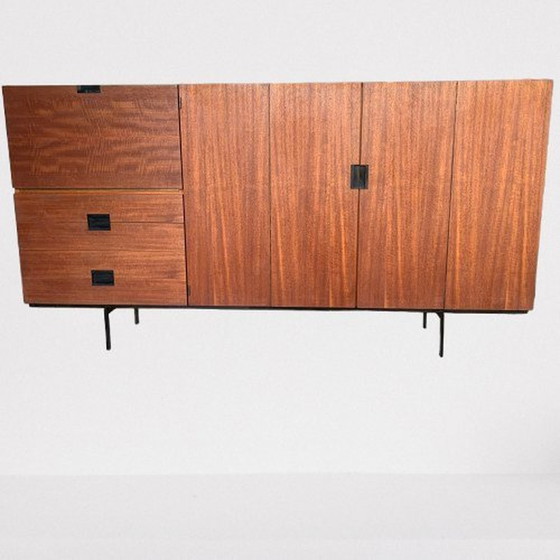 Japanse serie Cu09 highboard van Cees Braakman voor Pastoe Lange uitvoering met vier deuren, vier laden en een barkast in teakfineer Puur design met een zwevend effect dankzij het minimale metalen zwarte onderstel 226 cm breed, 45 cm diep en 117 cm hoog. Nederlands design uit de late jaren 50 Licht gerestaureerd, er blijven minimale gebruikssporen conform de leeftijd 5.500 EUR