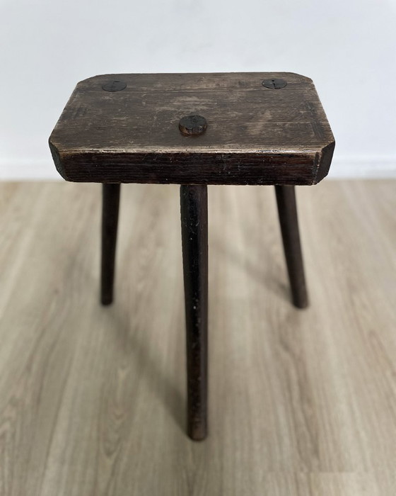 De kruk is vervaardigd uit massief hout (vermoedelijk eiken) met een schitterende, diepe natuurlijke patina die door decennia van gebruik is ontstaan. De constructie is oerdegelijk met de karakteristieke doorlopende pen-en-gatverbindingen die zichtbaar zijn in de zitting.