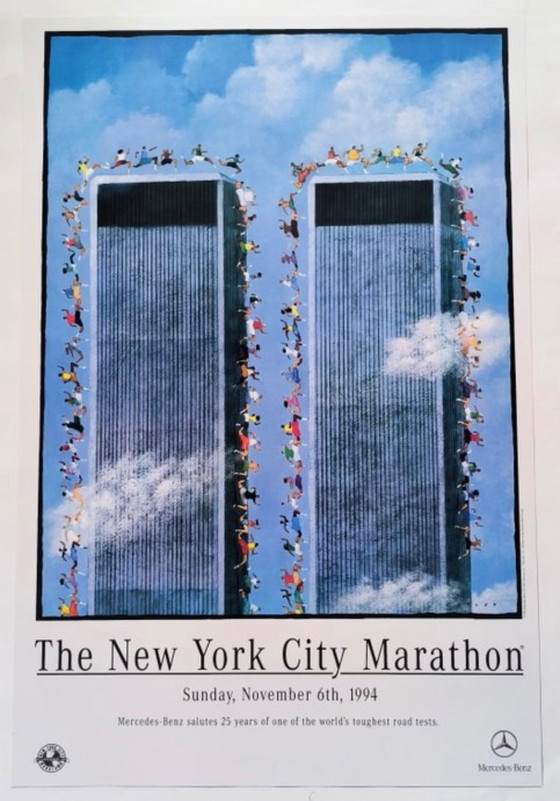 Dave Cutler: The New York City Marathon Poster "World Trade Center" 1994. Originele poster van de New York Marathon 1994, gemaakt door de kunstenaar Dave Cutler. Een van de weinige posters met het World Trade Center voor een evenement dat hardlopers van over de hele wereld aantrekt. Artiest: Dave Cutler Jaar: 1994 Afmetingen: 91 x 61 cm. Staat: Uitstekend