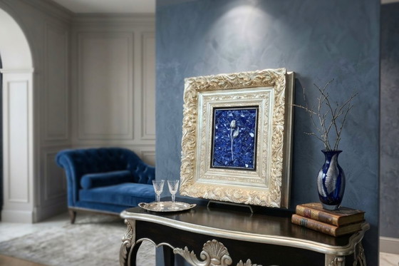Dit is niet zomaar een schilderij, maar een uniek stuk hoogwaardig Italiaans vakmanschap. De combinatie van cementiet en de schittering van Murano-glas, ingesloten in een frame dat de esthetische waarde verdrievoudigt, maakt dit werk tot een investering in schoonheid en exclusiviteit.