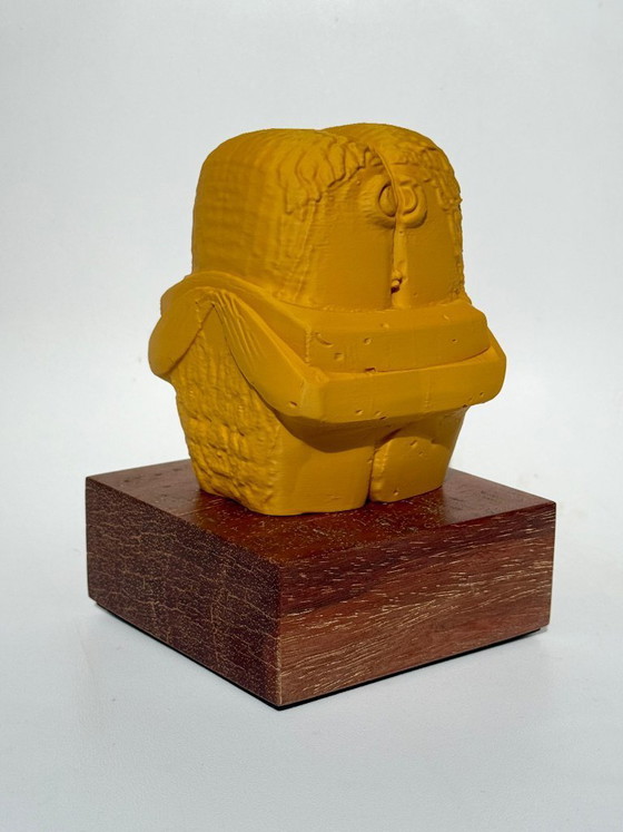 Dit sculpturale werk is een hedendaagse herinterpretatie van De Kus van Constantin Brâncuși, herzien door de lens van digitale fabricage. In plaats van het origineel te repliceren, gaat het werk een dialoog ermee aan – de essentiële geometrie ervan wordt vertaald naar een nieuwe materiële en tijdelijke context.