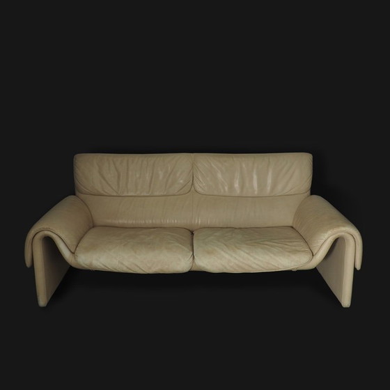 De Sede DS-2011 bank in crèmekleurig leer. De bank is ontworpen in de jaren 80 in Zwitserland. Met een breedte van 180 cm passen er gemakkelijk 3 personen in. De Sede -2011 is een klassiek designstuk dat past in kleine ruimtes met zijn delicate vorm. De bank is in originele staat en heeft wat liefde nodig, vandaar de prijs.