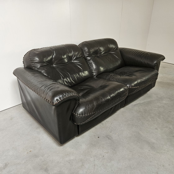 Vintage Zwitserse De Sede bank, model DS101 in zwart leer. De Sede staat bekend om zijn kwaliteit en comfort, deze bank is uitschuifbaar naar een relax stand. De bank is gereinigd en staat in de leerolie, klaar voor de volgende. Glimt nog iets na van de olie, dit zal mat wegtrekken.