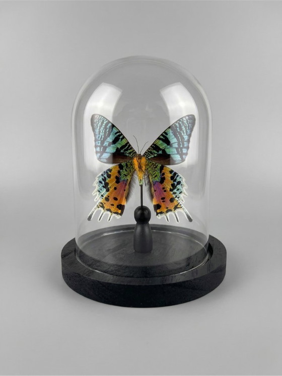 Prachtig exemplaar van de Urania ripheus-vlinder, ook wel bekend als de Madagaskar-zonsondergangvlinder, gepresenteerd onder een glazen koepel op een zwarte houten voet.