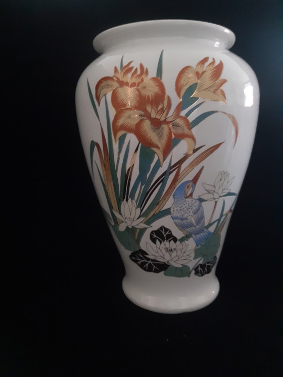 Zeldzame witte editie van een Italiaanse vaas van Décor Exclusiv. Het betreft het motief met een ijsvogel in bloemen, 20 cm hoog, diameter 14 cm, witte editie met gekrulde rand. Goede vintage conditie zonder zichtbare beschadigingen of herstellingen. Een koopje voor de liefhebbers van dit genre.