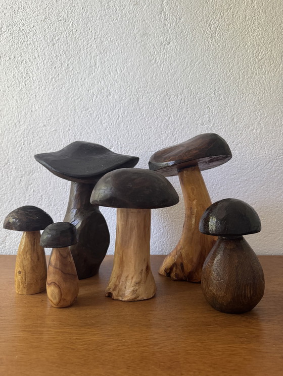 Een prachtige vintage set van 6 decoratieve houten paddenstoelen die een warm, rustiek tintje aan je huis zullen geven. Elk stuk is uniek, met de hand gesneden uit verschillende houtsoorten, waardoor de natuurlijke tinten en nerven van het materiaal worden benadrukt. De donkere kapjes met pennen contrasteren mooi met de lichtere poten, wat een prachtig visueel effect creëert; zeer goede staat