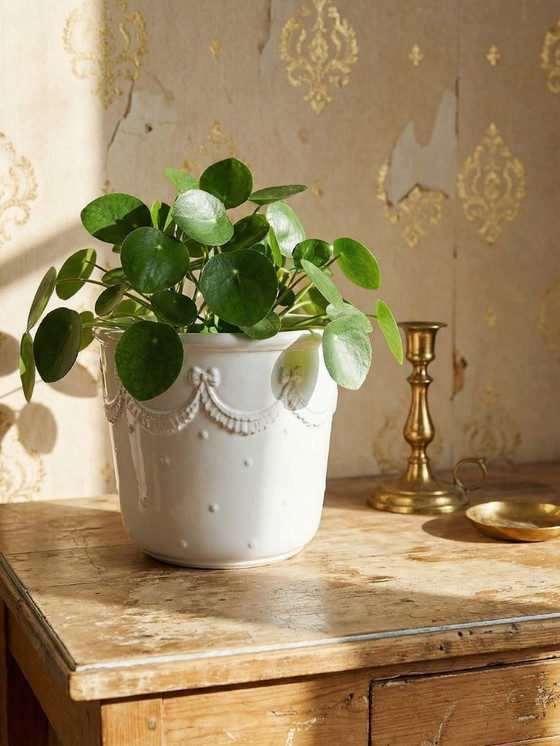 Decoratieve witte aardewerken plantenpot uit Bassano, Italië, vintage shabby chic.