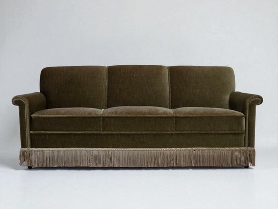 Deense 3-zitsbank uit de jaren 70, groen meubelvelours, poten van teakhout.