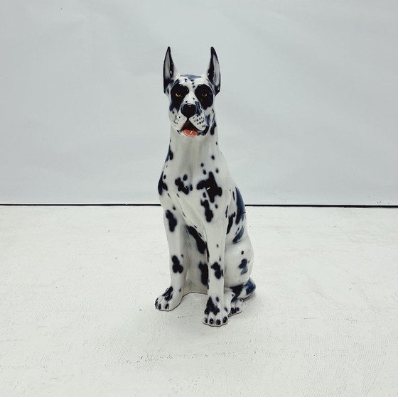 Uniek handgemaakt beeld van een deense dog. Dit Hollywood Regency beeld, vervaardigd van met de hand beschilderd keramiek en gemaakt in Italië, zal ongetwijfeld een verbluffende en stoere uitstraling aan je interieur toevoegen!