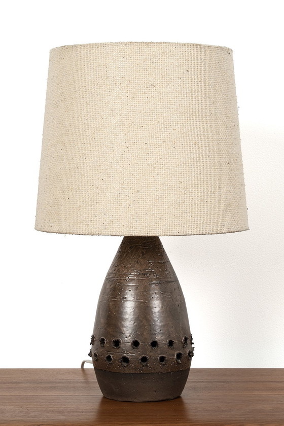 Deense keramiek tafellamp met oude kap. Deze stijlvolle lamp is gemerkt en is in goede vintage staat. Measurements: H. 54 cm; Ø 33 cm.