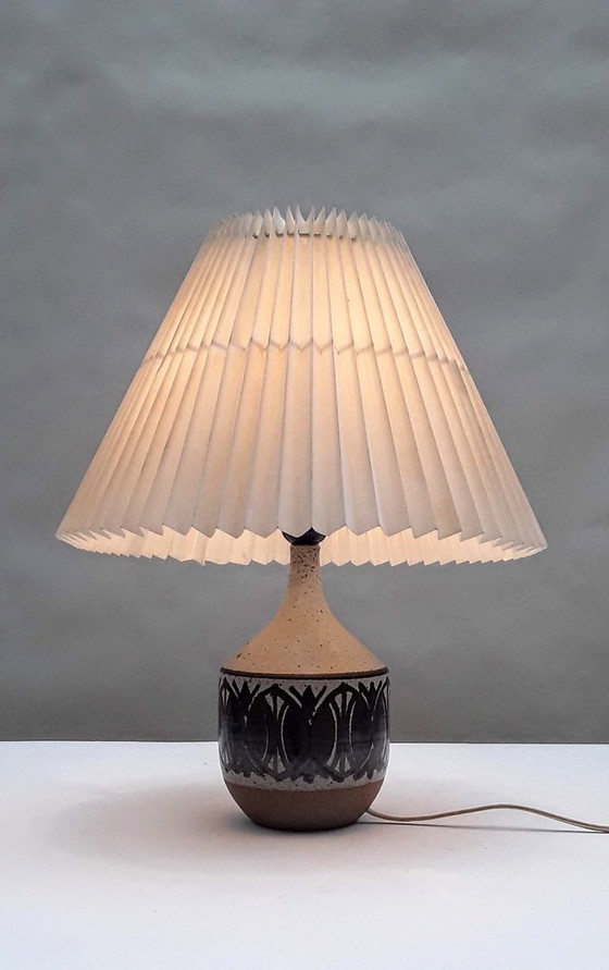 Zeldzame Deense Keramische Tafellamp met geplooide Kap . Gesigneerd Ontwerp ( zie foto ) , Marianne Starck voor Michael Andersen Keramiek Bornholm - Denmark . Keramische ( steengoed ) Lamp in Ecru Grijs met abstracte decoratie in donker Bruin . Geplooide Kap in papier / perkament . Hoogte Lamp : 27 cm . Met Kap : 42 cm . Diameter Lamp : 13 cm . Diameter Kap : 35 cm .